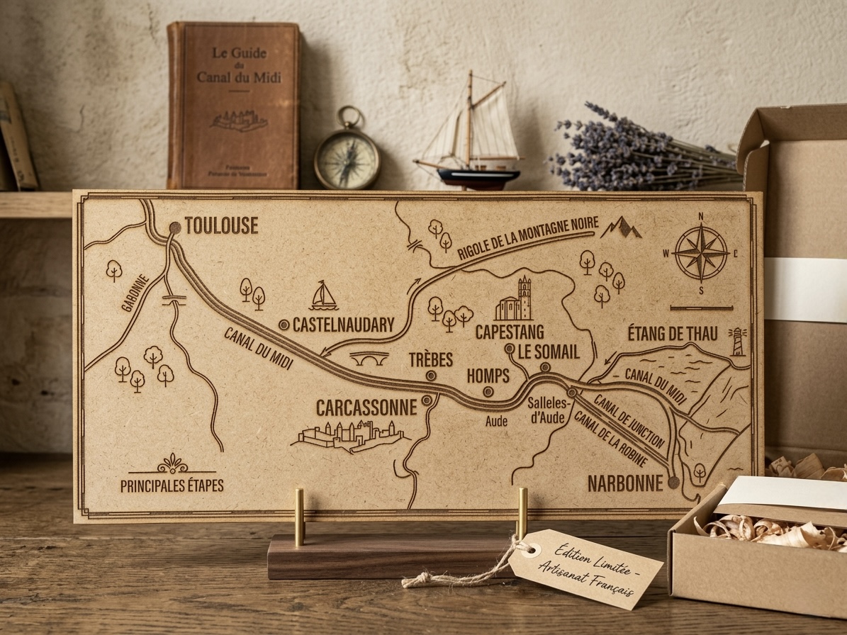 Gravure monumentale du Canal du Midi — patrimoine UNESCO capturé dans le bois. Idéale pour une décoration murale unique ou un cadeau d'exception.